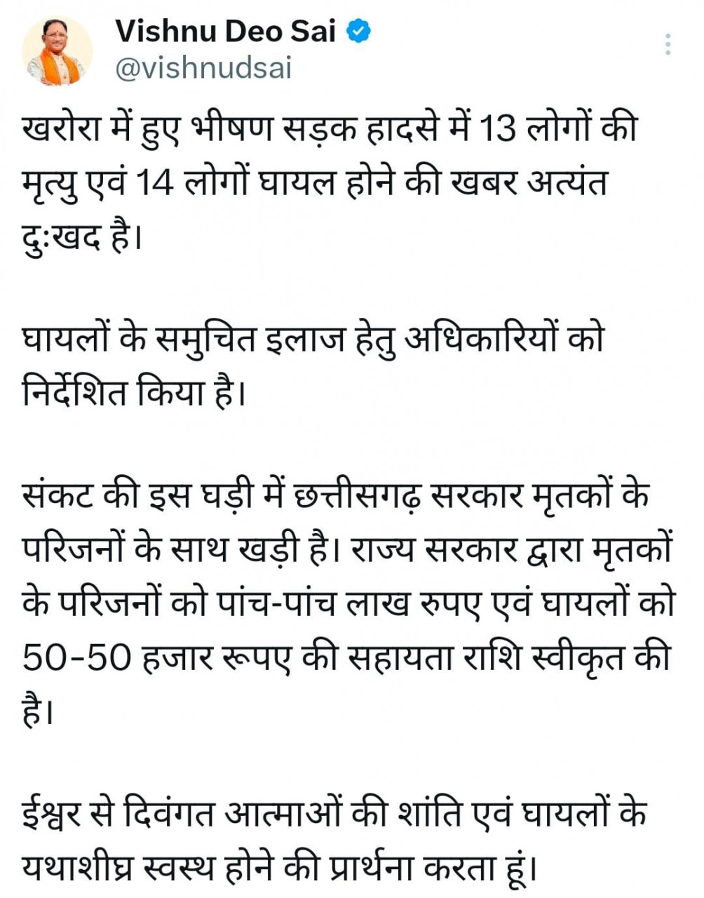मुख्यमंत्री साय ने अपने संदेश में कहा, “खरोरा में हुए भीषण सड़क हादसे की खबर अत्यंत पीड़ादायक है। मैं दिवंगत आत्माओं की शांति और घायलों के शीघ्र स्वस्थ होने की ईश्वर से प्रार्थना करता हूँ। संकट की इस घड़ी में राज्य सरकार पीड़ित परिवारों के साथ पूरी संवेदनशीलता के साथ खड़ी है।”