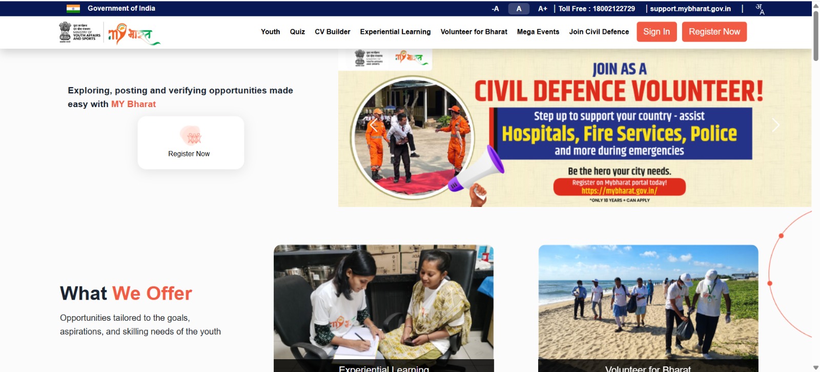 इस पोर्टल के माध्यम से युवा स्वयं को सिविल डिफेंस वॉलंटियर के रूप में भी रजिस्टर कर सकते हैं। इसके अंतर्गत वे आपातकालीन सेवाएं जैसे फायर सर्विस, अस्पताल और पुलिस विभाग की गतिविधियों में सहायक भूमिका निभा सकते हैं।