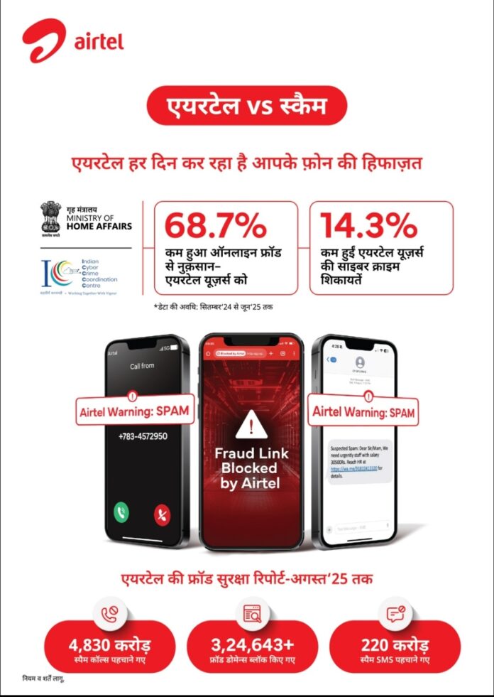 *नई दिल्ली / रायपुर, 16 सितम्बर 2025:* भारती एयरटेल ने आज घोषणा की है कि उसके द्वारा शुरू की गई एंटी-फ्रॉड पहलों के चलते साइबर अपराध की शिकायतों में उल्लेखनीय गिरावट आई है। इस प्रभाव की पुष्टि हाल ही में गृह मंत्रालय (एमएचए) के भारतीय साइबर क्राइम कोऑर्डिनेशन सेंटर (आई 4 सी) द्वारा जारी किए गए आंकड़ों से भी हुई है।