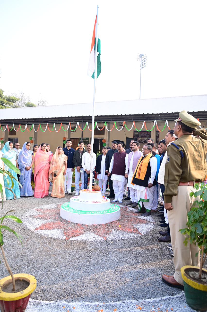26 जनवरी 2026/ आज गणतंत्र दिवस के पावन अवसर पर उपमुख्यमंत्री श्री विजय शर्मा के कवर्धा स्थित विधायक कार्यालय में गरिमामय समारोह का आयोजन किया गया। इस अवसर पर साहू समाज के अध्यक्ष श्री पति राम साहू ने विधायक कार्यालय परिसर में राष्ट्रीय ध्वज तिरंगा फहराया। ध्वज फहराने के साथ सभी ने राष्ट्रगान, राष्ट्रीयगीत गाया और देश की एकता, अखंडता एवं संविधान की गरिमा को बनाए रखने का संकल्प लिया गया।