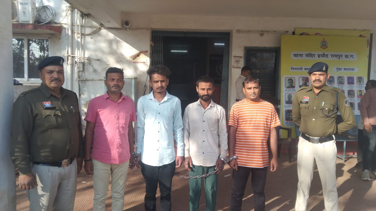 इसी तारतम्य में दिनांक 07.02.26 को एण्टी क्राईम एण्ड साईबर यूनिट की टीम को सूचना प्राप्त हुई कि थाना मंदिर हसौद क्षेत्रांतर्गत गैस गोदाम के पास कुछ व्यक्ति ताशपत्ती से रूपयों का हार-जीत का दांव लगाकर जुआ खेल रहे है। जिस पर वरिष्ठ अधिकारियों के निर्देशन में एण्टी क्राईम एण्ड साईबर यूनिट तथा थाना मंदिर हसौद पुलिस की संयुक्त टीम द्वारा उक्त स्थान में जाकर रेड कार्यवाही किया गया। रेड कार्यवाही के दौरान जुआ खेलते 04 जुआरियों को गिरफ्तार कर उनके कब्जे से नगदी रकम 4,200/-रूपये, ताशपत्ती, 04 नग मोटर सायकल तथा 01 नग क्रेटा कार जुमला कीमती लगभग 14,74,200/- रूपये जप्त कर जुआरियों के विरूद्ध थाना मंदिर हसौद में अपराध क्रमांक 61/26 धारा 3(2) छत्तीसगढ राज्य जुआ प्रतिषेध अधिनियम 2022 का अपराध पंजीबद्ध कर कार्यवाही किया गया।