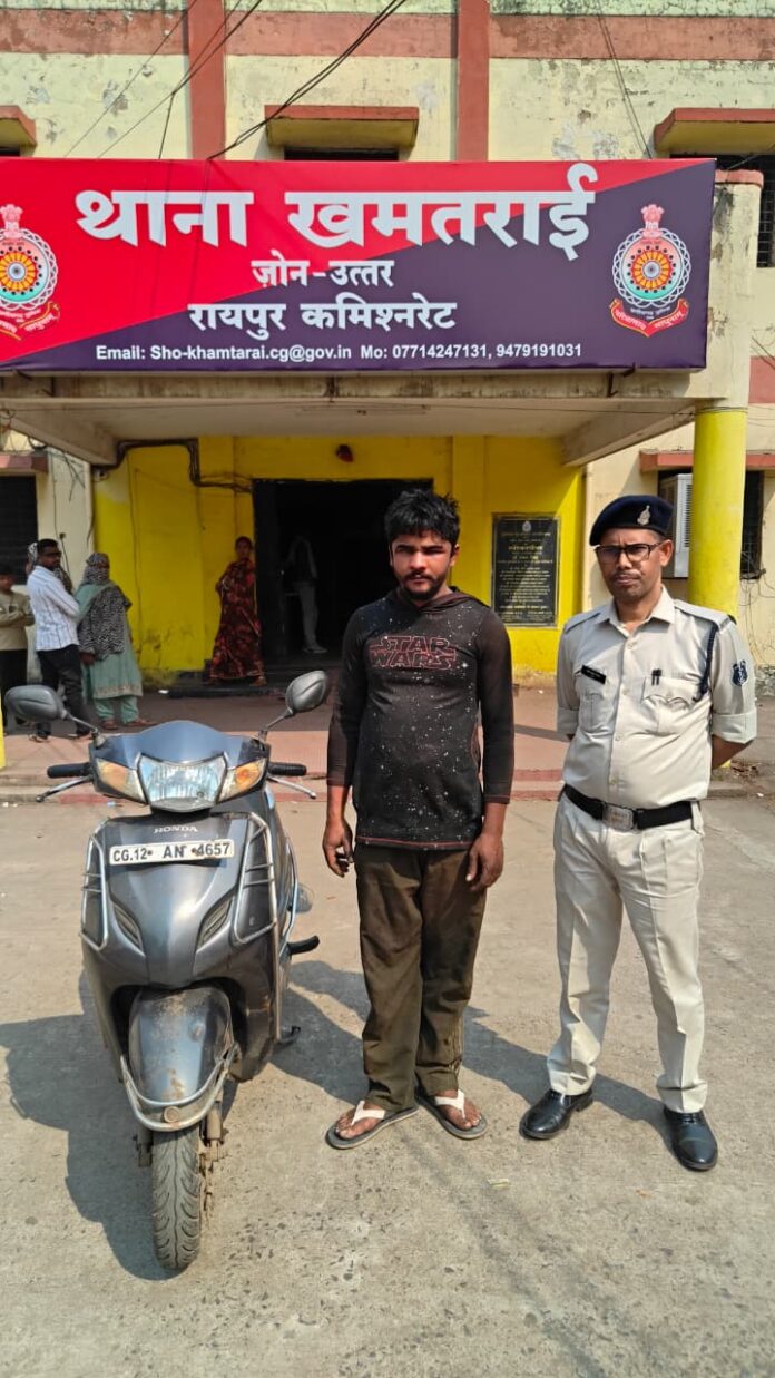 विवरण- दिनांक 13.03.2026 को प्रार्थी धीरेन्द्र कुमार साहू रात्रि 09.00 बजे ट्रान्सपोर्ट नगर रावांभाठा देशी शराब दुकान शराब लेने आया, प्रार्थी द्वारा शराब दुकान के बाहर पार्किंग में होण्डा एक्टिवा कमांक सीजी 12 एन 4657 को खड़ा किया था, बाद प्रार्थी 15 मिनट में वापस आकर देखा तो उनकी होण्डा एक्टिवा खड़ी किये गये स्थान पर नहीं था आस-पास तलाश किया नही मिलने से प्रार्थी के रिपोर्ट पर थाना खमतराई में अपराध कमांक 167/2026 धारा-303(2) बीएनएस दर्ज कर विवेचना में लिया गया।